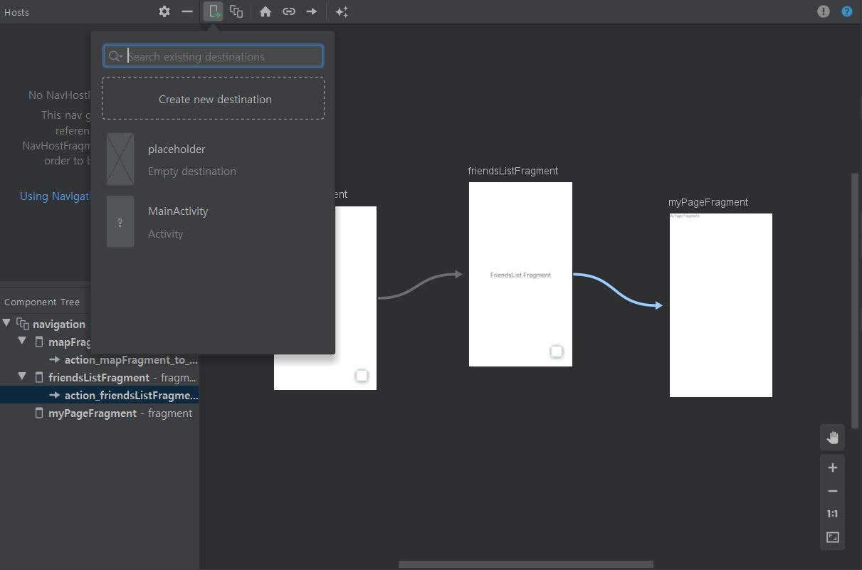 navigation.xml의 Design탭으로 들어가면 프래그먼트들간의 전환 액션을 쉽게 설정할 수 있다.