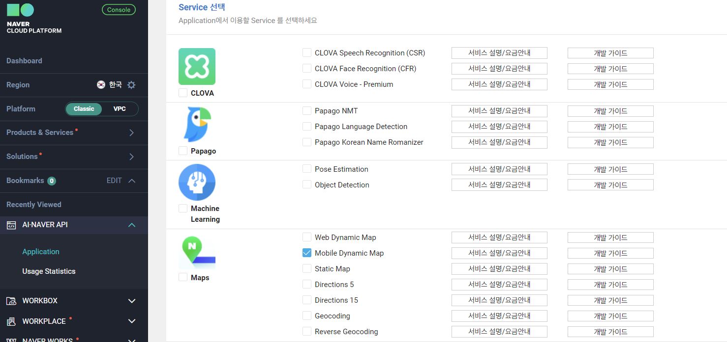 먼저 네이버 맵 API를 이용하기 위해서는 Naver Cloud Platfrom에 가입하여 애플리케이션을 등록해야한다.