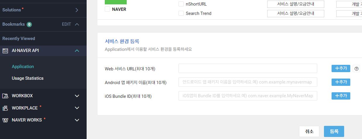 밑으로 내려서 <서비스 환경 등록>탭에 본인의 안드로이드 스튜디오 프로젝트 패키지명을 입력하고 등록을 완료하면 된다.
