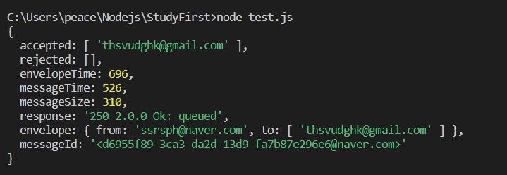 - terminal에서 node test.js명령어로 만든 파일을 실행시키면 다음과 같이 성공적으로 보내진다.